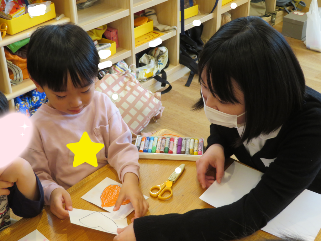 ハートの画用紙にクレヨンで好きな色を塗り🖍、ハサミを使って切り取り✂