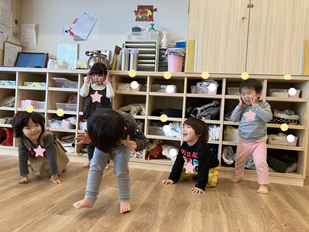 歌に合わせて体を動かしながら、葉っぱを集めたり、どんぐりを拾ったり♪🍂