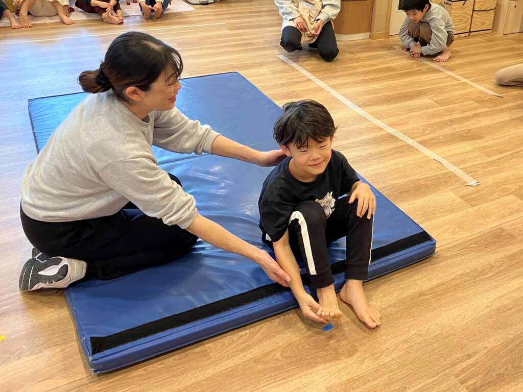 小学校に向けて「前転」「開脚前転」「後転」「ブリッヂ」「助走をつけて前転」に挑戦!