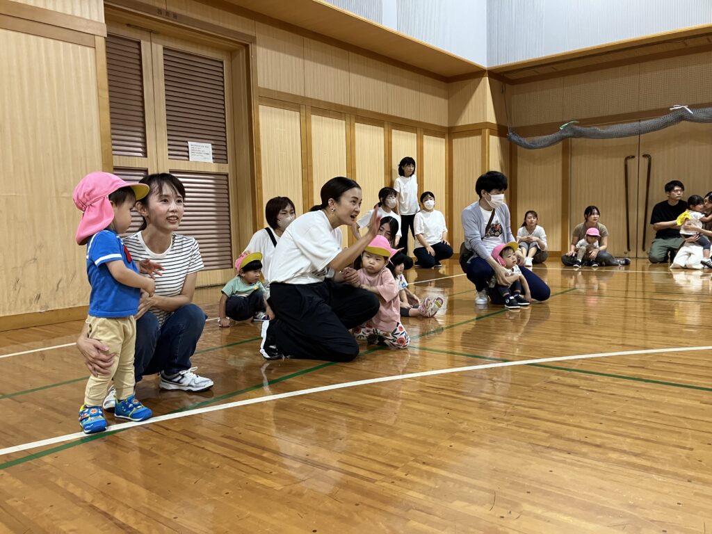 さくら組では、初めての場所や大人数に驚いて泣いてしまう子もいましたが、体操やかけっこ、親子種目などで少しずつ笑顔が出てきました!