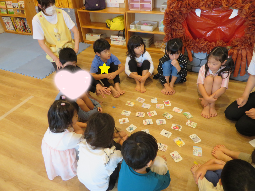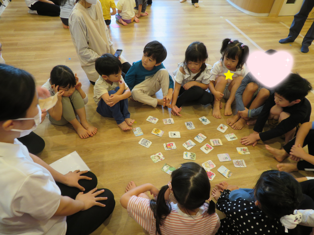 年中・年長チームは、学生さんが読む文章を聞き、カルタに書いてあるひらがなや絵を見て、お題に合ったカルタをゲット!