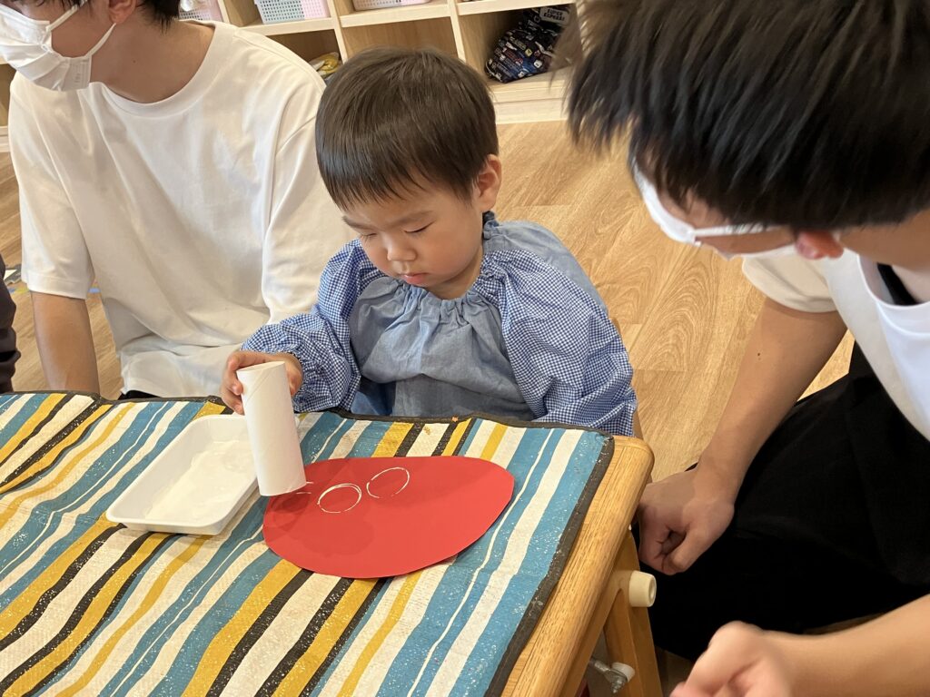 トイレットペーパーの芯を使って丸い模様を描いたり、マジックで顔を描きました🎨🖌