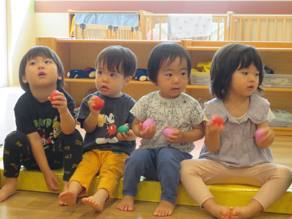 『キラキラ星』『とんぼのめがね』など子どもたちが好きな曲に合わせて楽器を鳴らしながら歌いました!