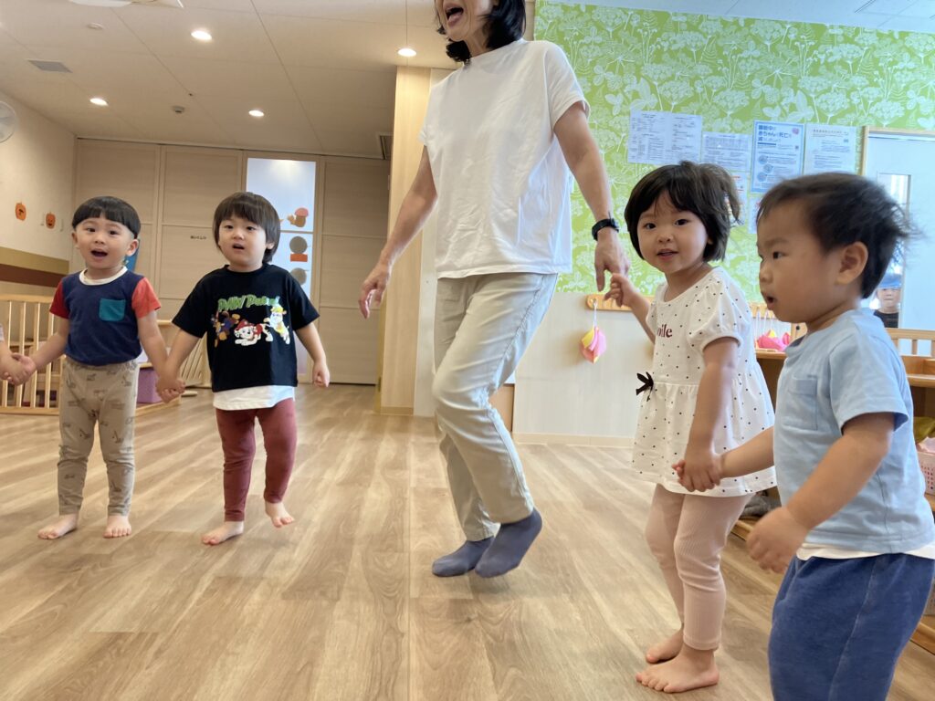 次は年齢別にピアノの音を聴いて、ギャロップ・歩く・しゃがむ・トンボなどの動きをしました!