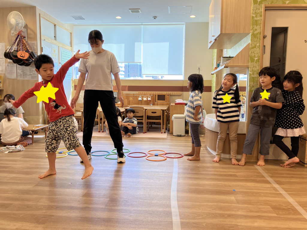 リズムに合わせて輪っかの中をケンケンパー!とジャンプできるようになったり、マット運動の後の顔の角度や両腕の伸ばし方をアドバイスいただき、さらにカッコよくなった子どもたち✨