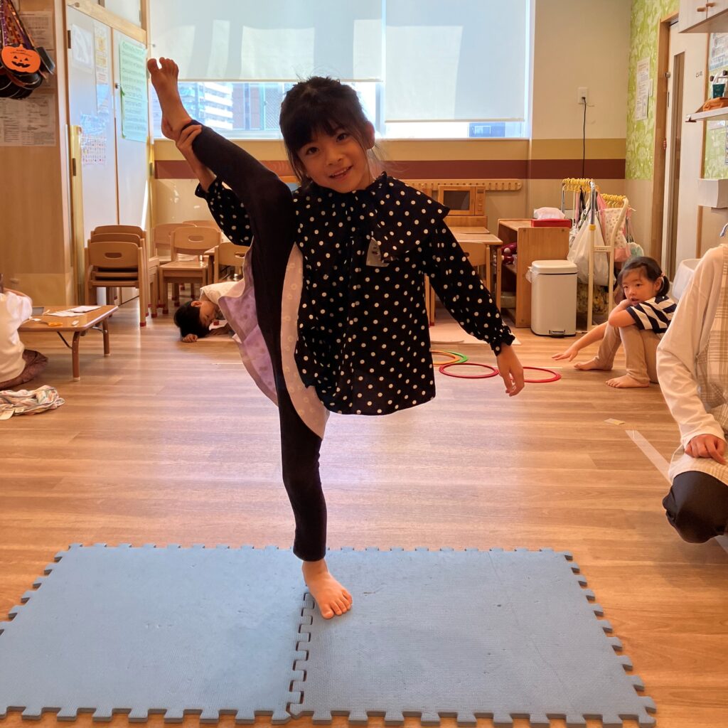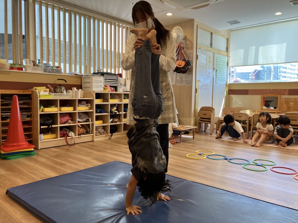 年長さんは、サーキットの最後に行う「ブリッジ」「Y字バランス」「側転」「倒立」「なわとび」の練習♪