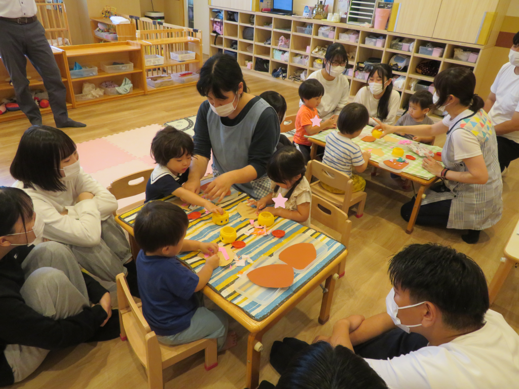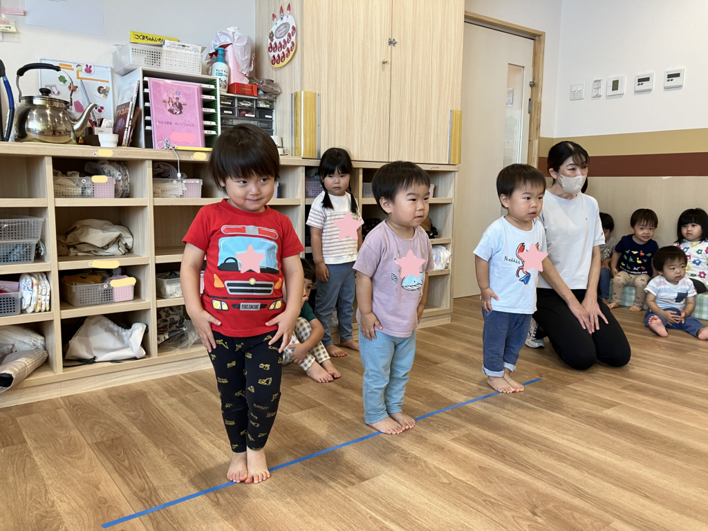 ひまわり組では、両足で「グーパー」「ケンパー」「ケンケンパー」とリズムよくジャンプする練習をした後に、運動会で行うサーキットを見てもらいました♪