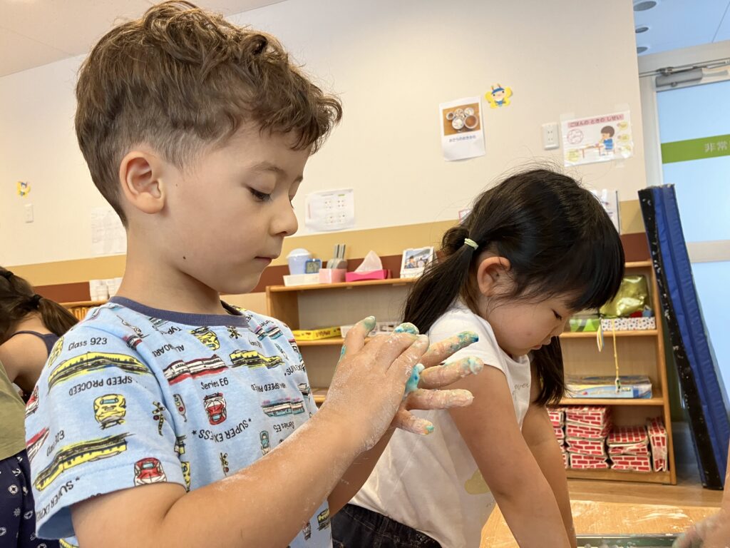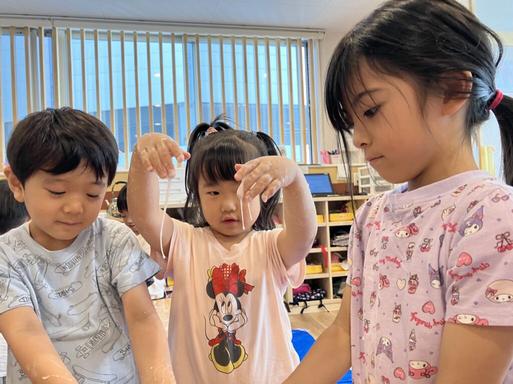 粉の状態の感触を楽しんだ後は、少しずつ水を加えてトロトロになる感触を楽しむ子どもたち!