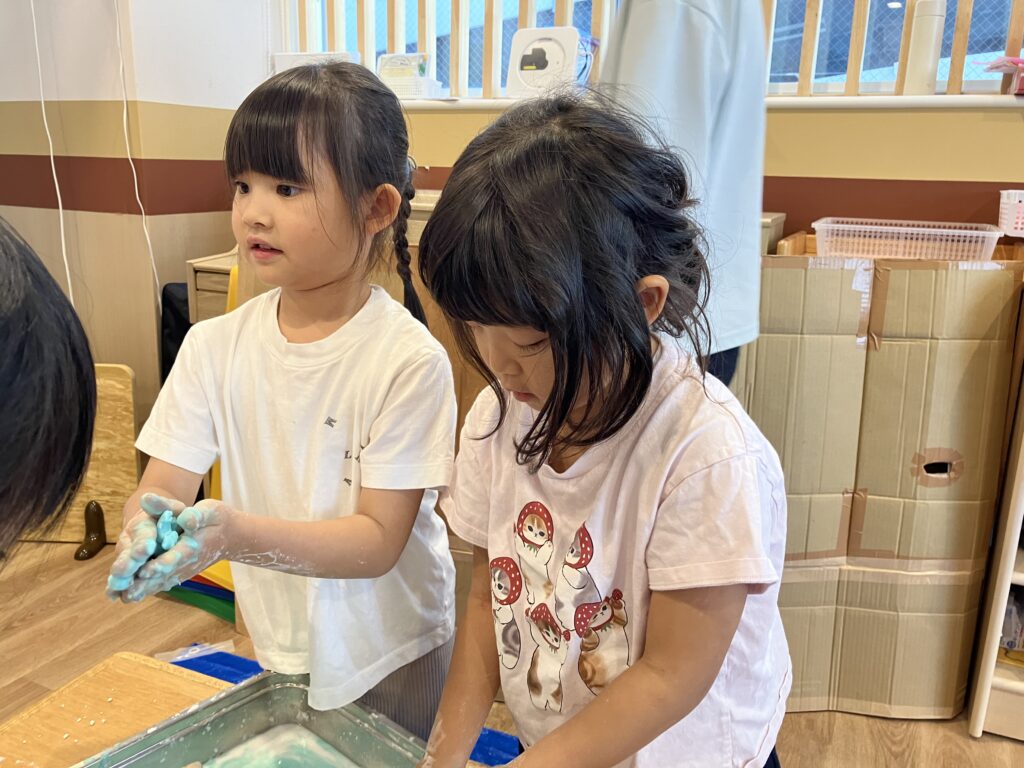 食紅を使って好きな色のスライムを作ったり、お友だち同士で違う色の片栗粉を交換し合いながら色を混ぜ合わせていました(´∪`○)