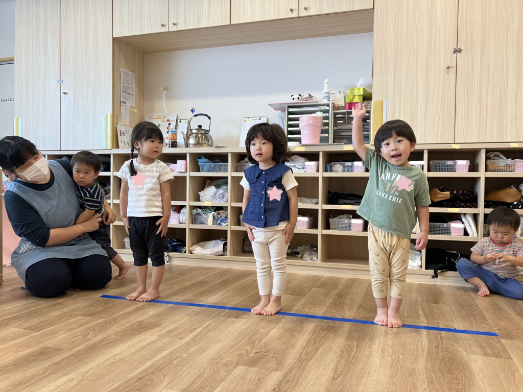 先生にお名前を呼ばれると「はーい!」と元気いっぱいにお返事する2歳児さんを見て、1歳児さんも同じようにお返事をしていました(´∀`∩✨