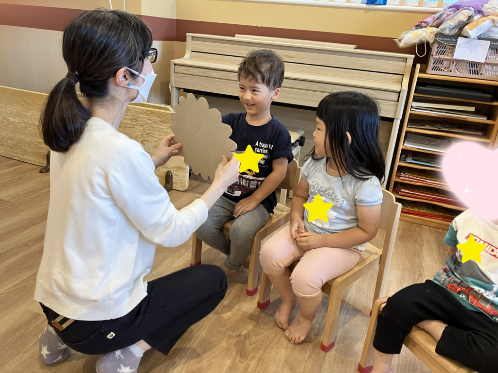 手の動きと一緒に海の生き物の英語の発音を習ったひまわり組さんは、手遊び(Ocean Animals)をして、魚釣りゲーム🦀