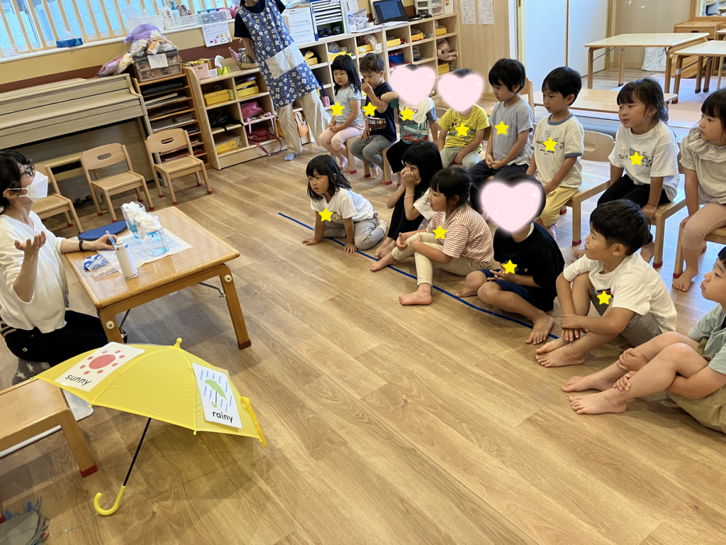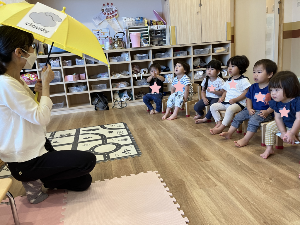先生手作りの傘には太陽や雲など天気に関係するイラストが付いており、子どもたちは興味津々でした😊