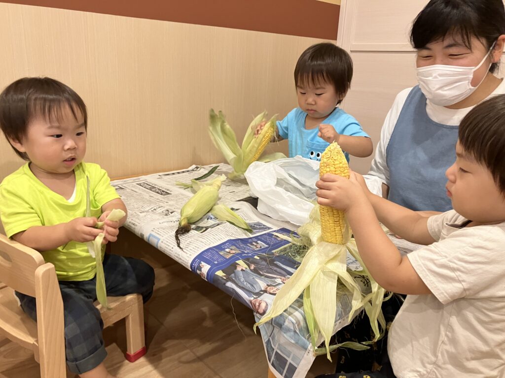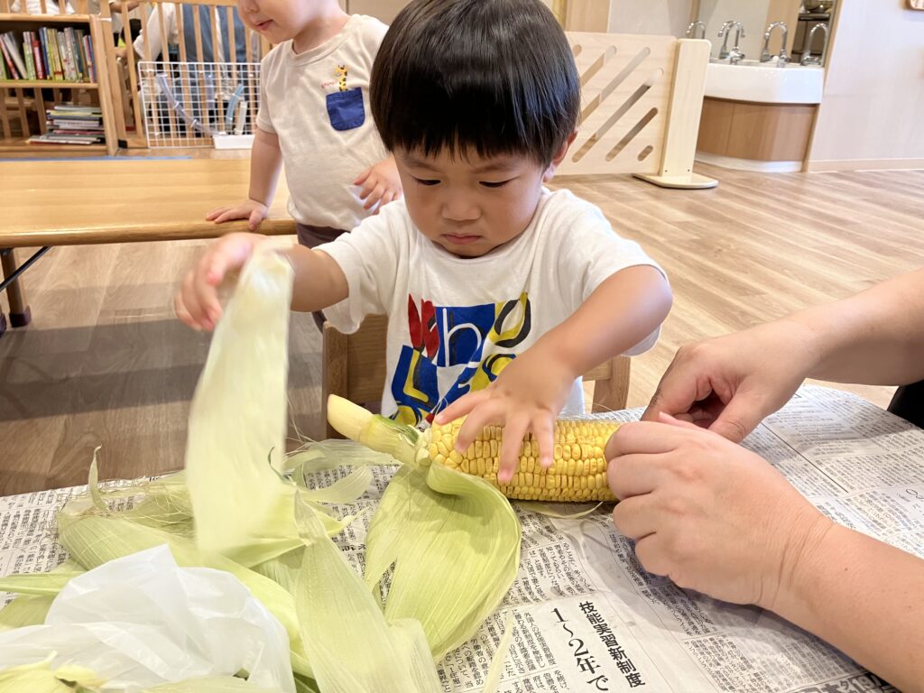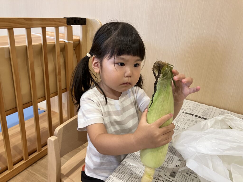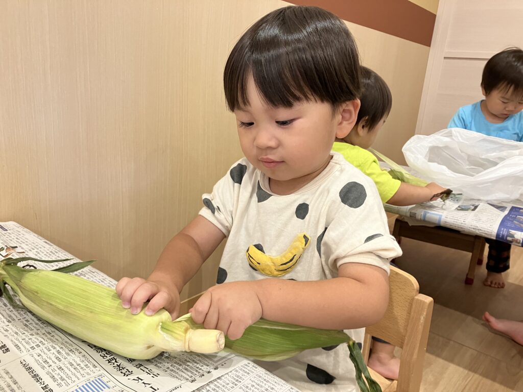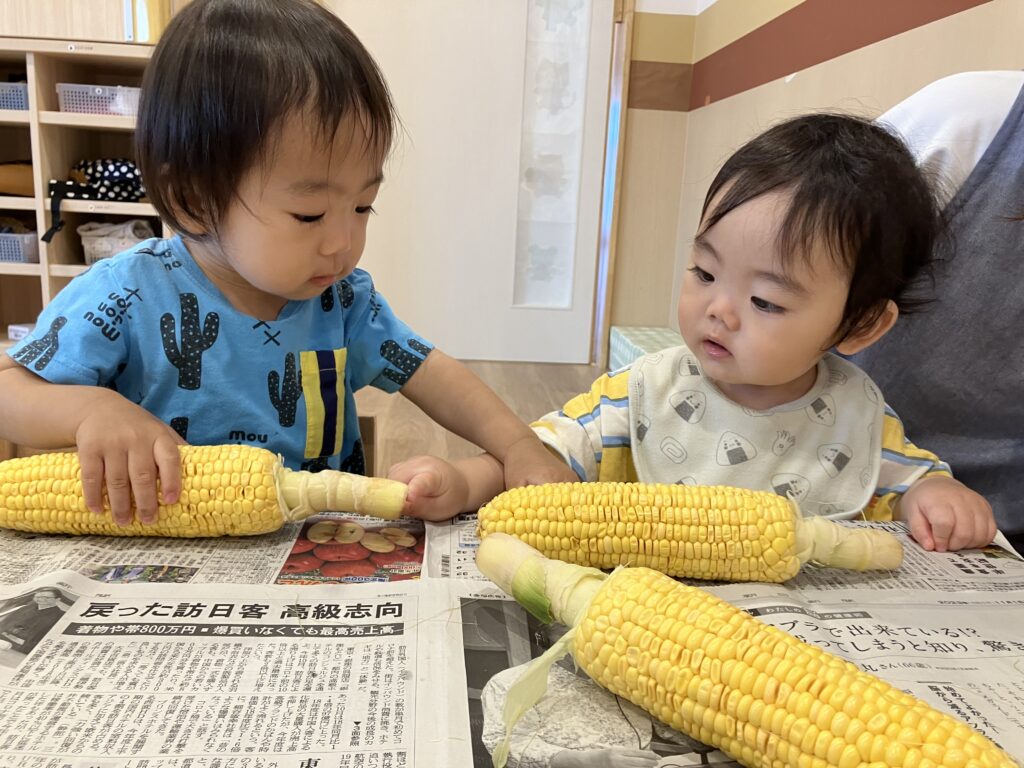 17日(水)にさくら組で行った食育では、0,1歳児さんの中で皮やひげ付きのトウモロコシを見てびっくりしていたり、怖がっている子も多く…なかなか手が…トウモロコシに伸びませんでした…🤣