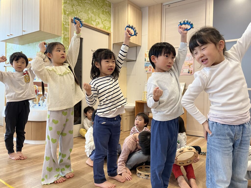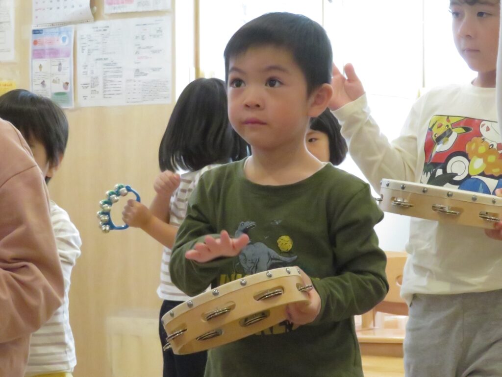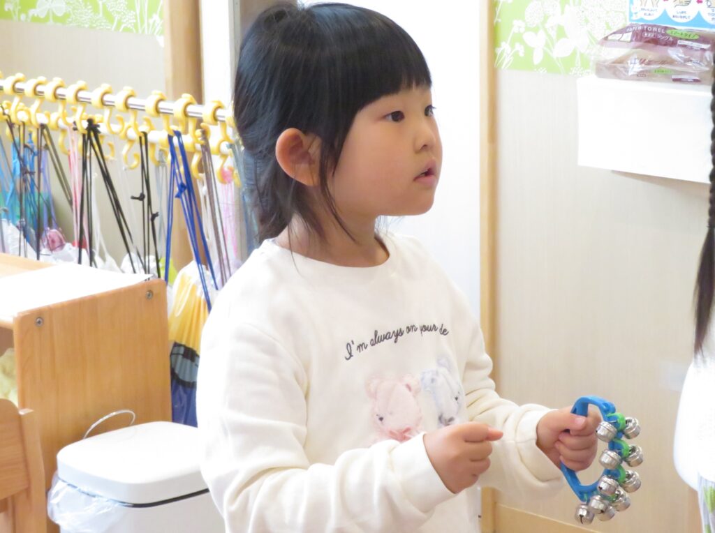 次に鈴・タンバリン・カスタネットを『やまの音楽家』のリズムに合わせて鳴らしました♪