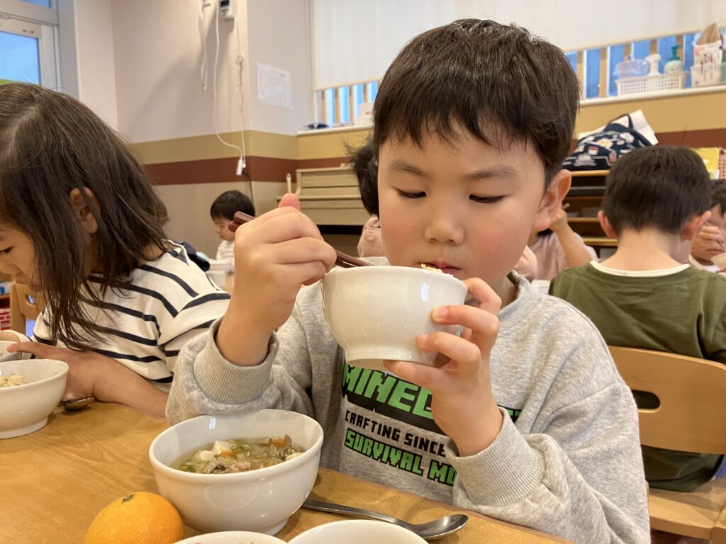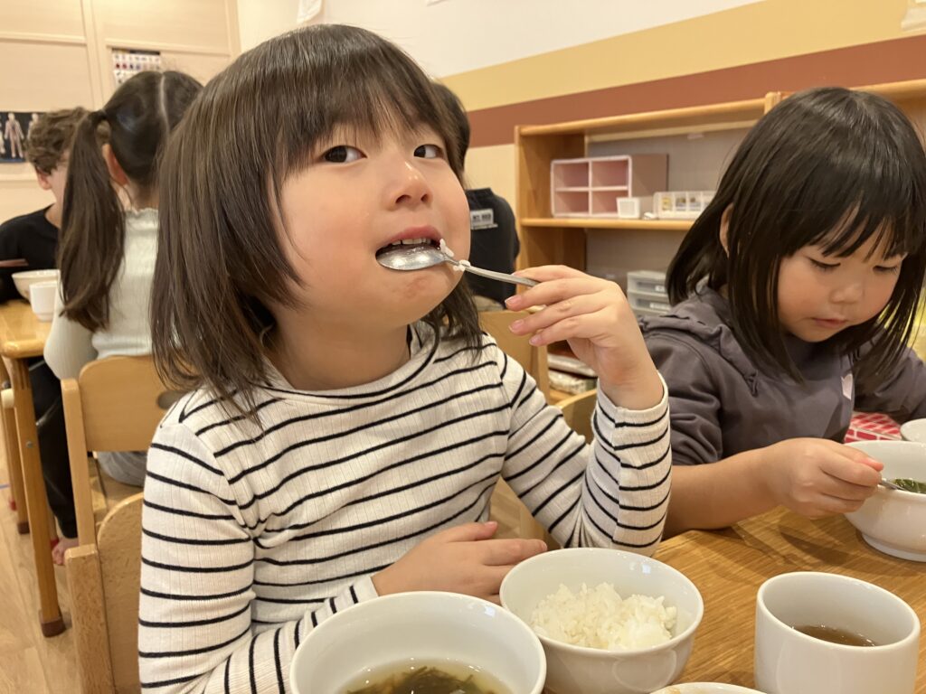 給食では、お友だちから「ご飯おいしい!」の声があがり、うれしそうな年長さんでした💕