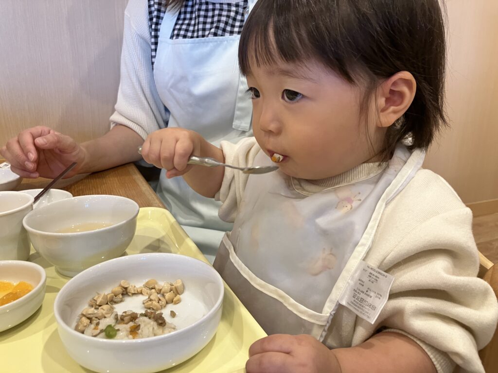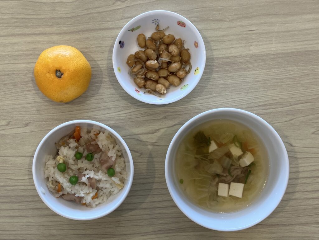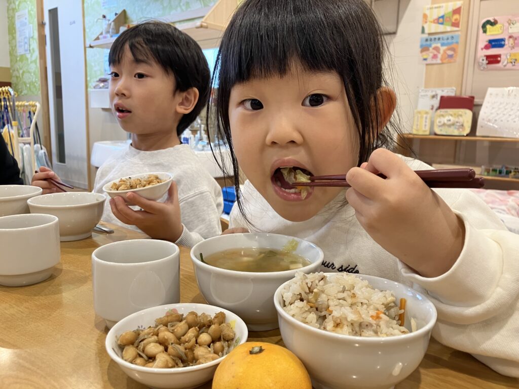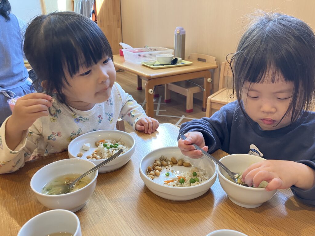 ひまわり組では、かやくご飯を見て「これは何?混ぜご飯?」と先生に質問する様子も見られ、楽しい給食の時間になりました✨