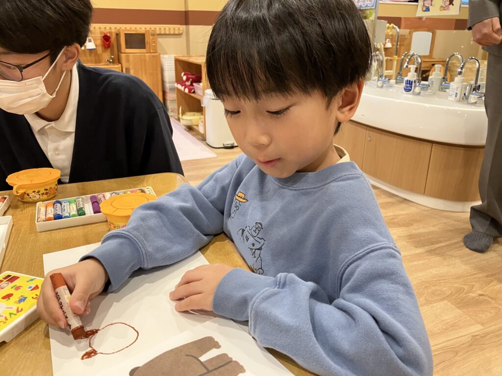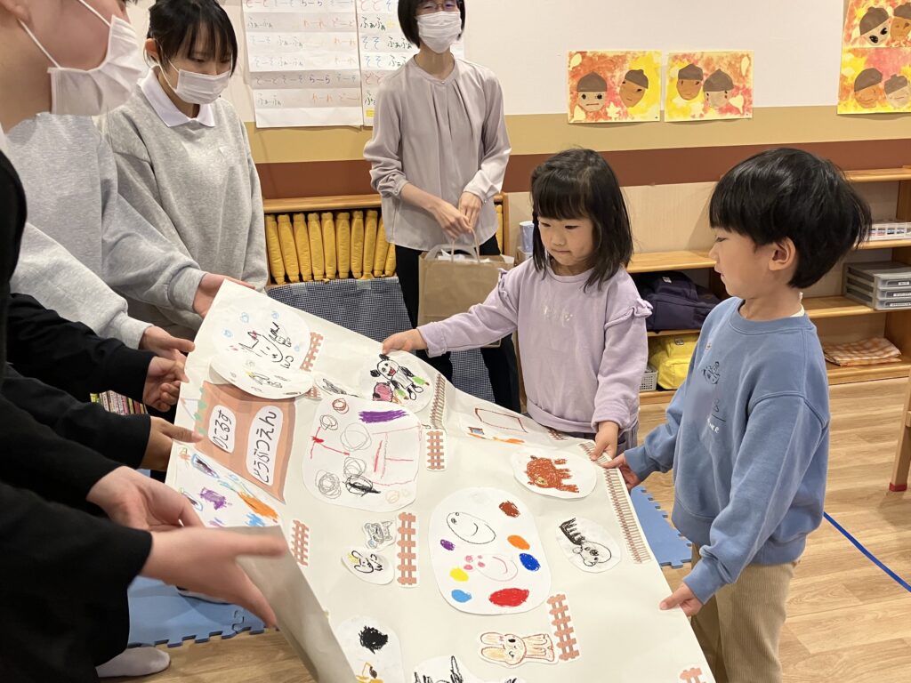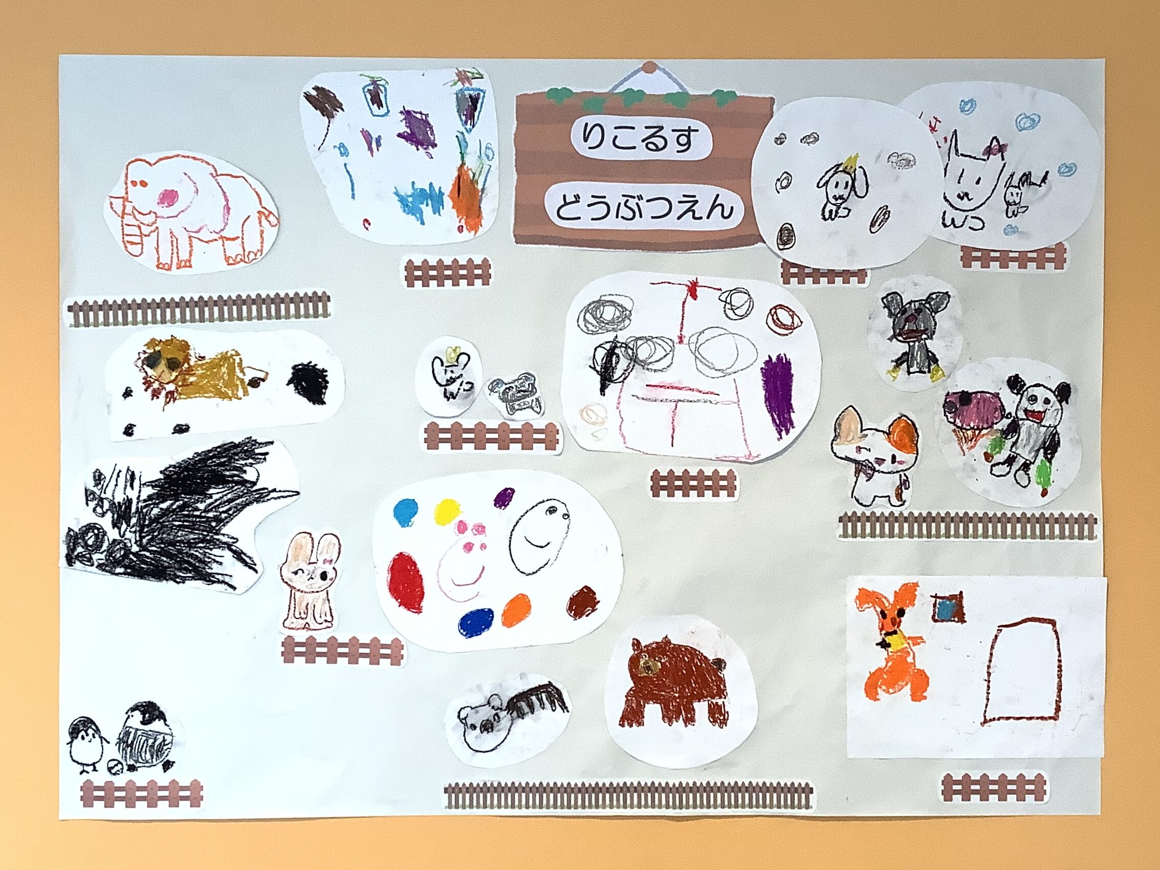 ひまわり組のみんなで動物の絵を描いて、学生さんが用意してくれた大きな紙に貼りつけて動物園を作ります!どんな動物園ができるかな?