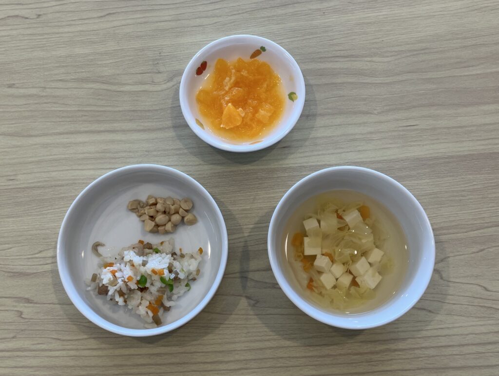 幼児食のメニューは、関西ならではの出汁の効いた『かやくごはん』、以前からの人気メニューでもある『揚げ大豆とじゃこのさっと煮』、大阪名物の『肉吸い』でした。