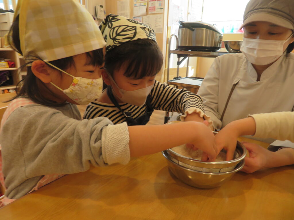 最初にお米の量り方やお米の研ぎ方を給食の先生に教わります。