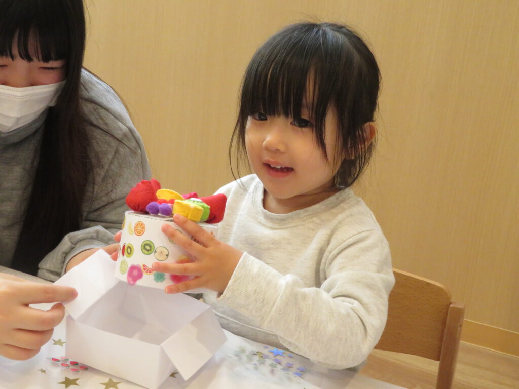 次に、学生さんが用意してくれたケーキの土台にシールを貼り付けたり、かわいいフェルトの果物を乗せて自分だけのクリスマスケーキを作りました🍰