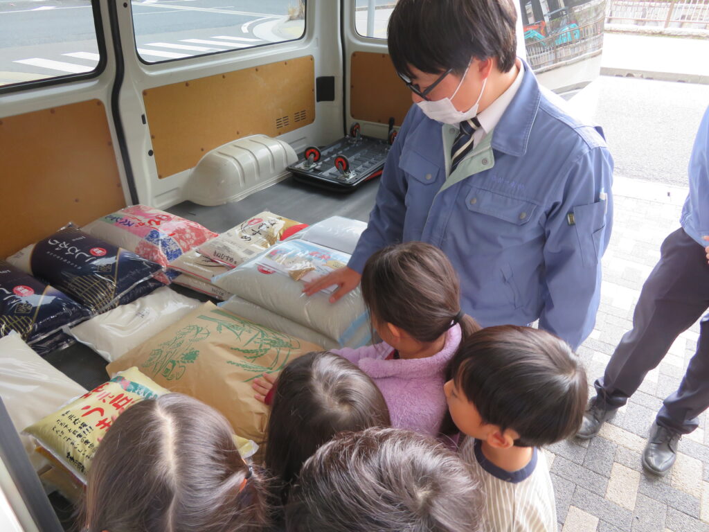 続いて、車の荷台にあるお米を見せていただき、お米にもいろいろな種類があることを知りました✨