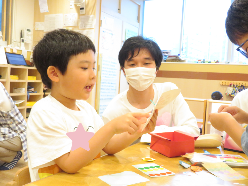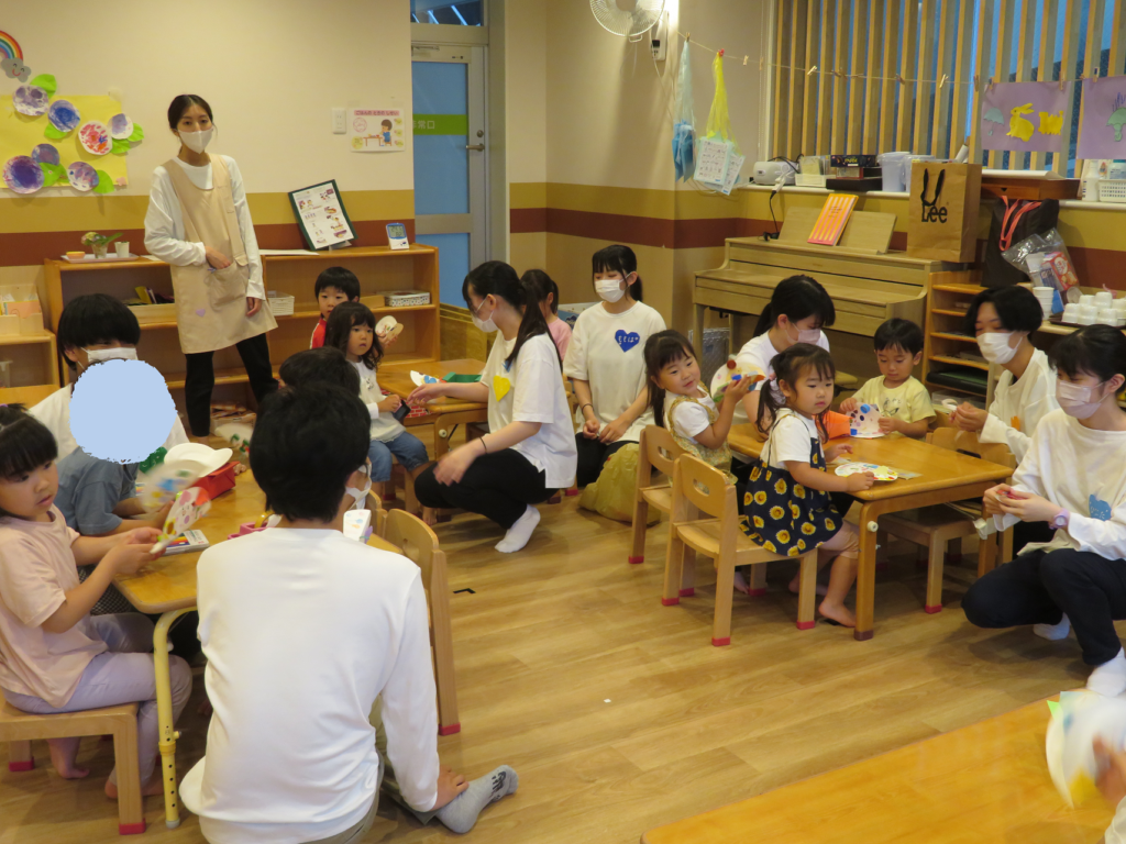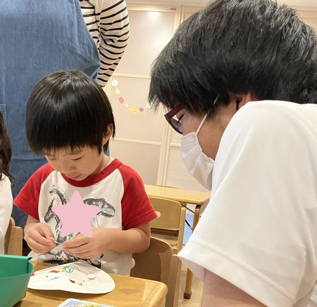 年中さんと年長さんは、学生さんが見守る中、写真入りの見本の用紙を見ながらハサミやのりを使って自分たちで進めていきました♪
