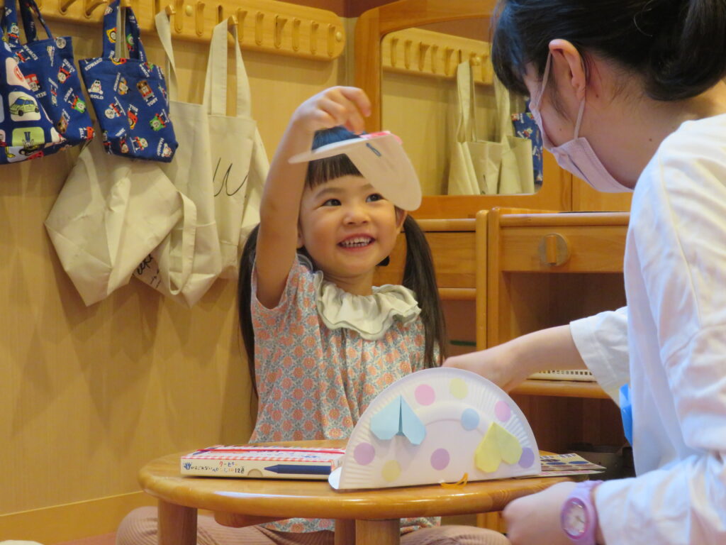 紙皿には可愛いシールや手作りの折り紙を貼ったり、色鉛筆でお絵描き♪