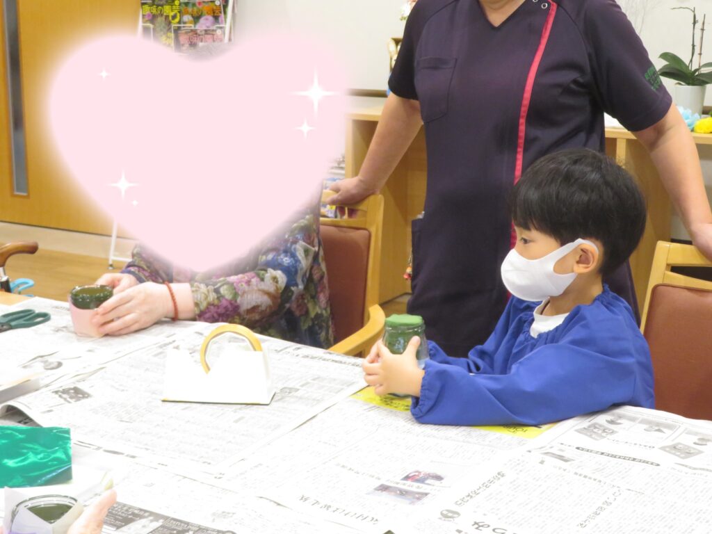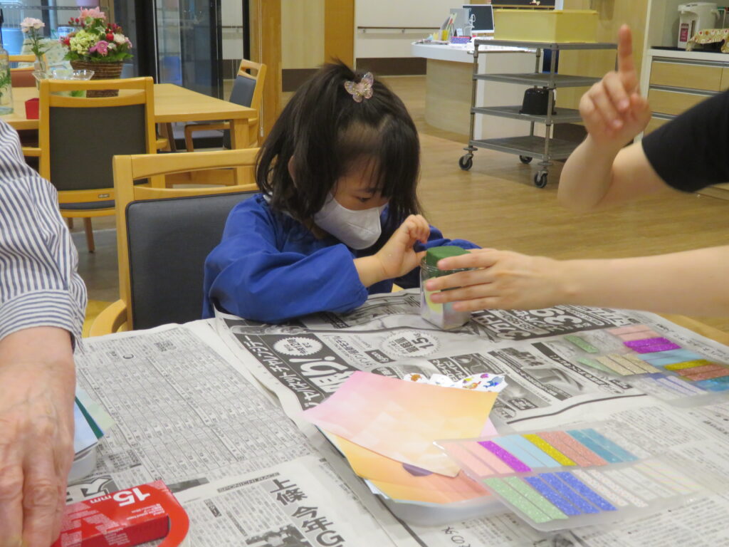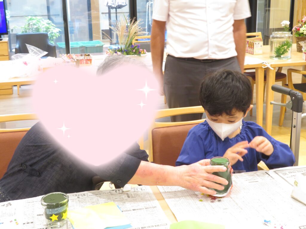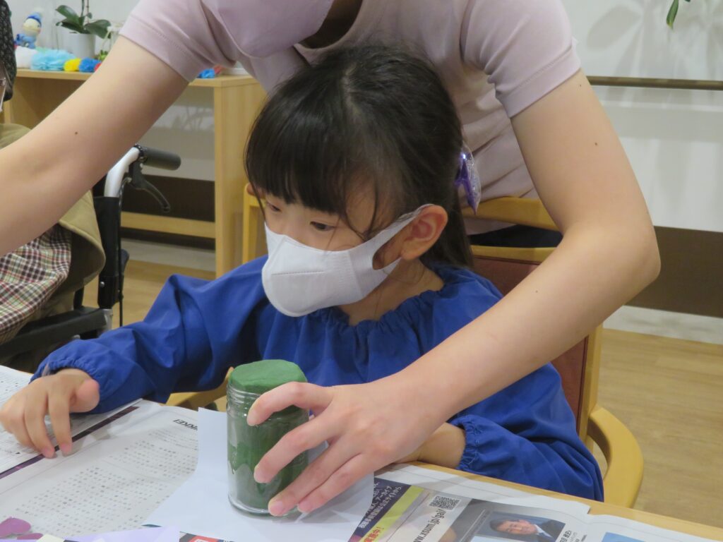 色紙がうまく瓶に貼り付けられず、利用者さんと協力して作成しました。