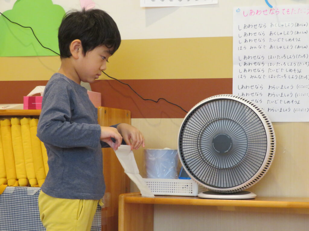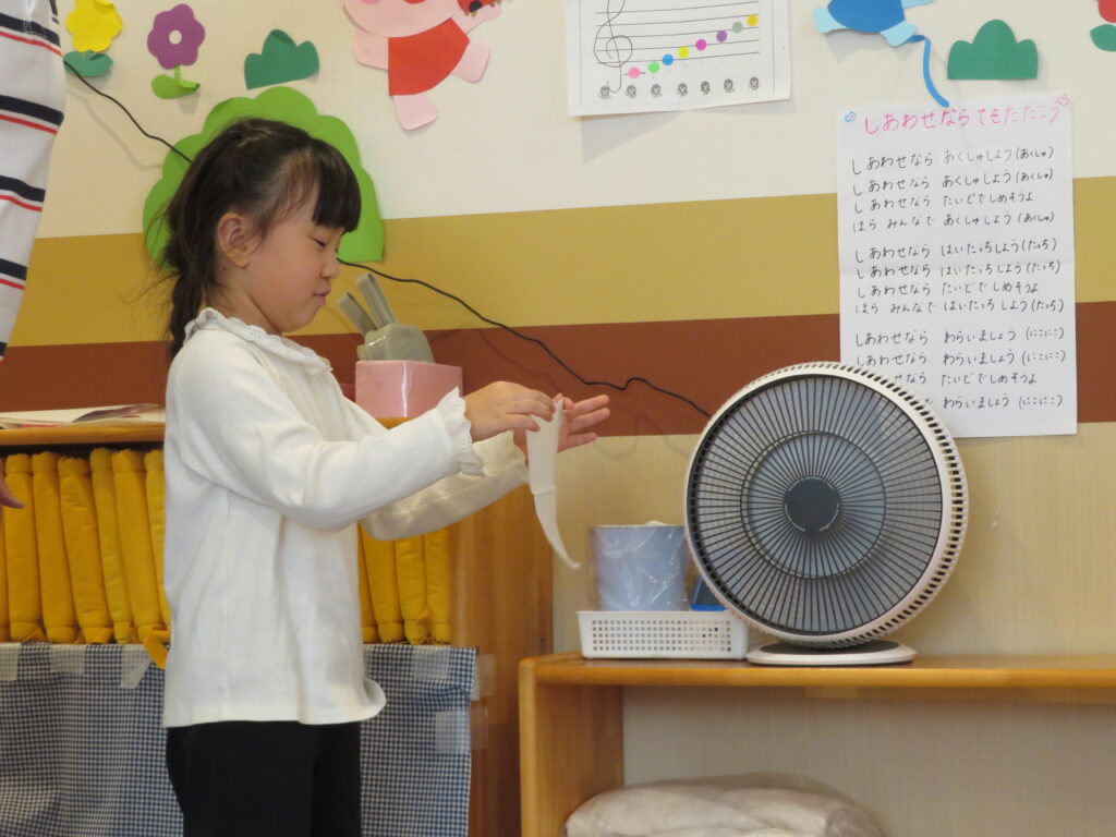 「飛行機はなぜ飛ぶのか?」「電車に乗る時になぜ黄色い線の内側で待つのか?」など、風についてティッシュペーパーとサーキュレーターを使って実験をしました♪