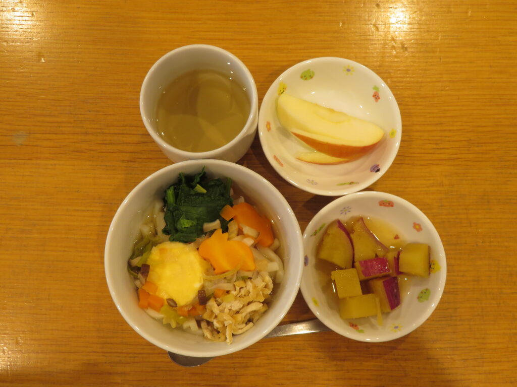 幼児食の献立は満月に見立てたたまごとうさぎ型のにんじんが入ったお月見うどん