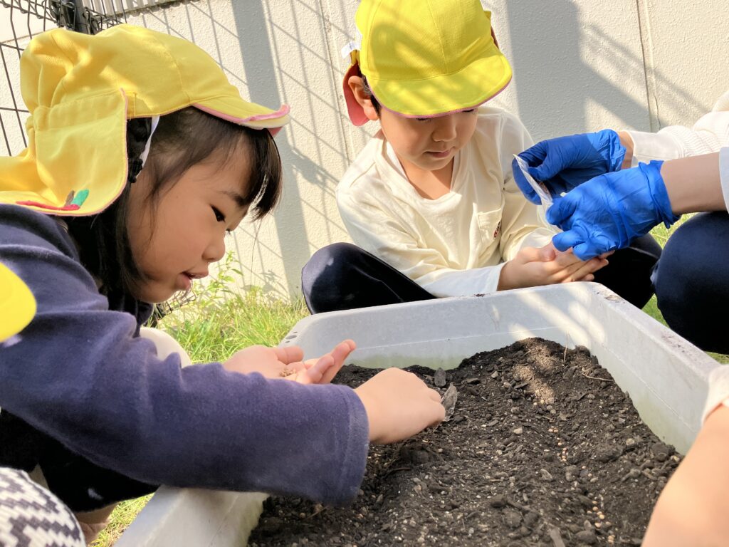 年少、年中、年長に分かれてプランターに土を入れていきます。最後に土の表面を平らにならして種まきの準備はばっちり!
