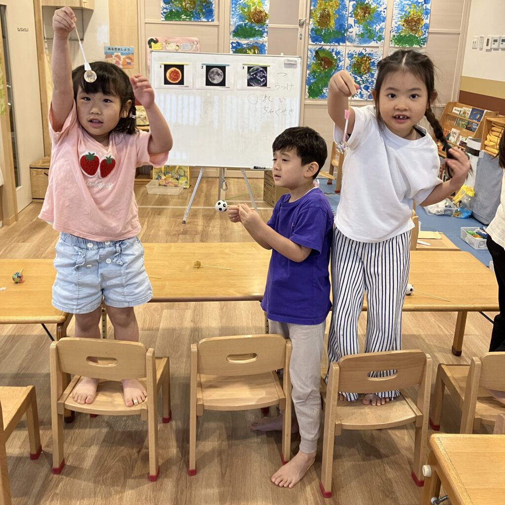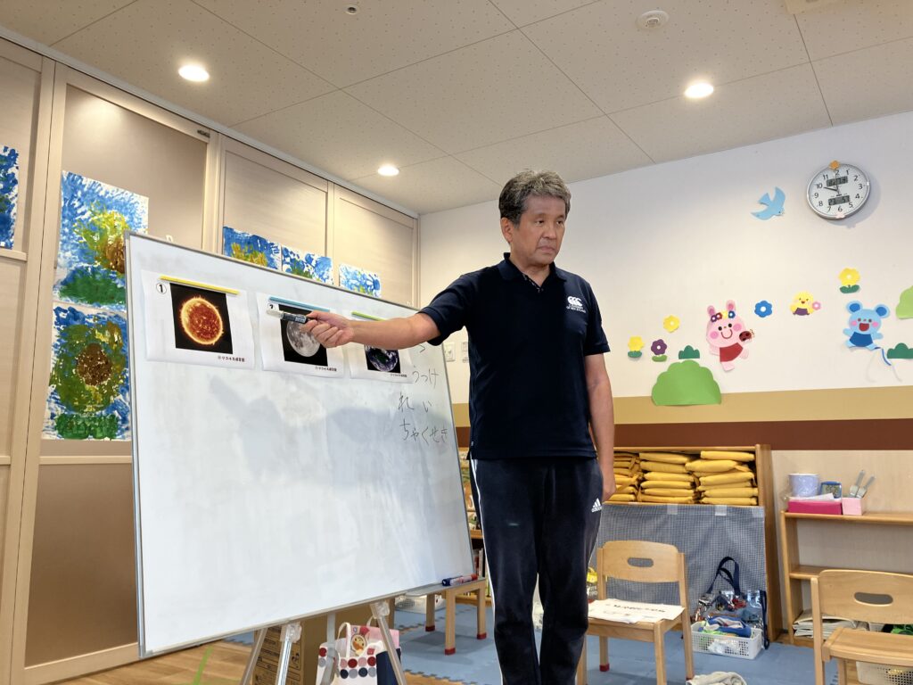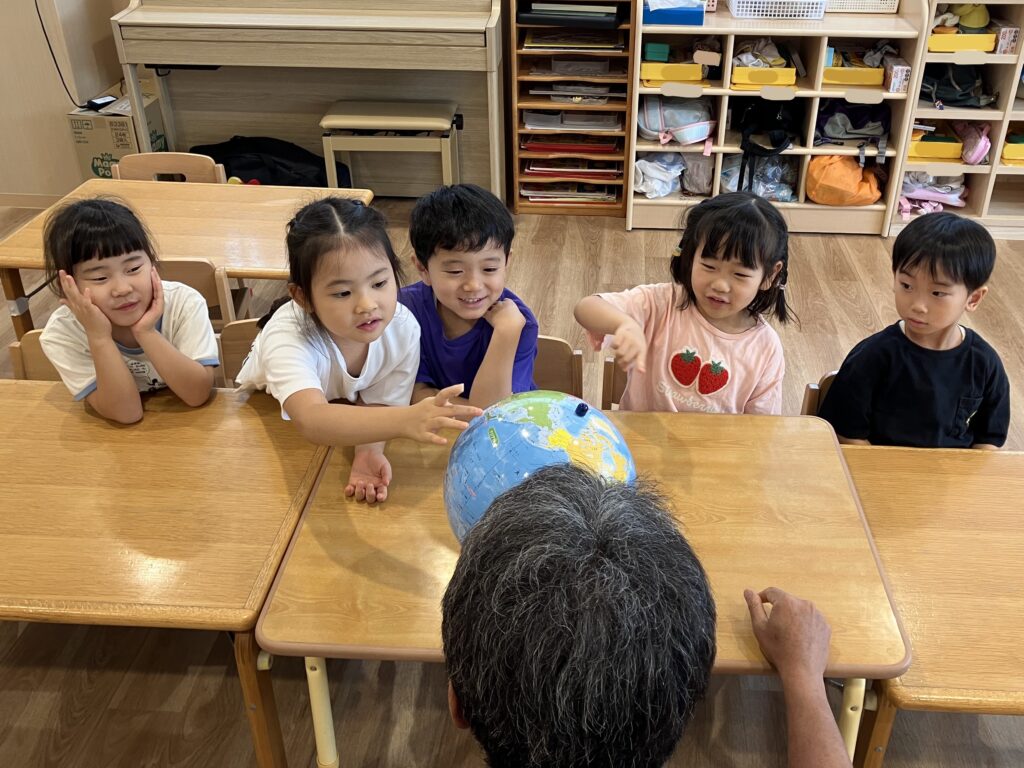 太陽・月・地球の写真が並ぶと「何で夜に見た月は黄色なのに、月が白いの?」といった質問や、地球儀を使った説明の時には、地球が回転している事や重力があること、回転速度が速いことを知ると「(速度が速いのに)何で夜になるのは遅いの?」など、疑問に思ったことを聞いて教えてもらいながら、沢山の発見をしていました!