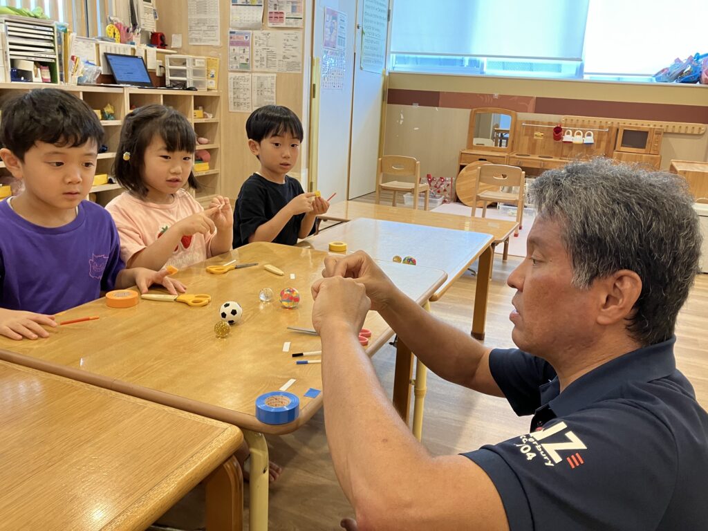 年少・年中・年長グループにわかれて、『風船投げ』『新聞紙ジャンケン』『だるまさんがころんだ』のゲームを学生さんと一緒に遊びました♪