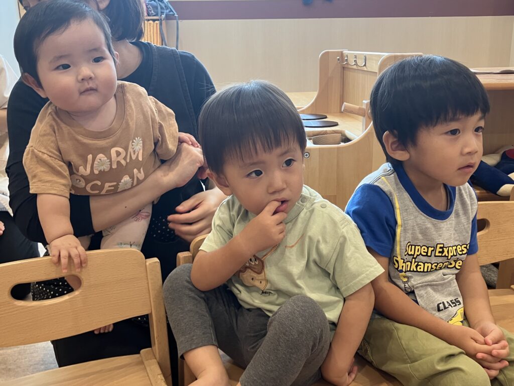 先生たちが実験の準備をしている様子を見て‟ワクワク たのしみ♪”な表情のひまわり組さん!