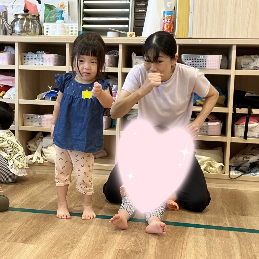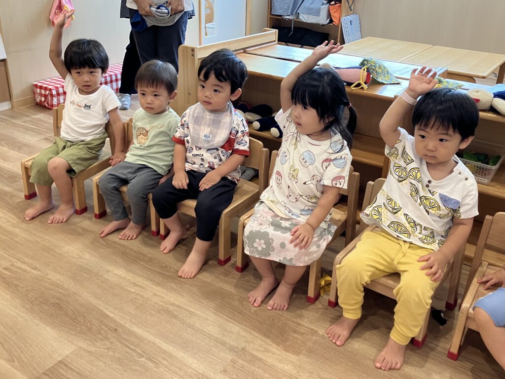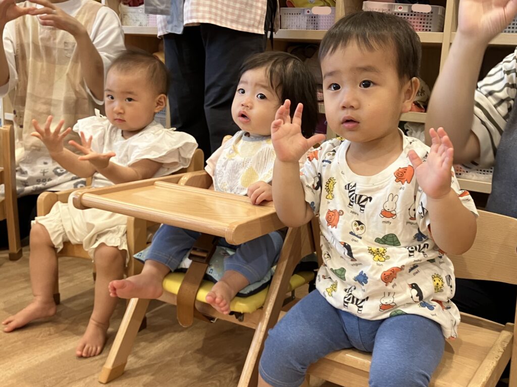 2歳児さんが立ってご挨拶している姿を見て、1歳児さんもマネをしていました🤭
