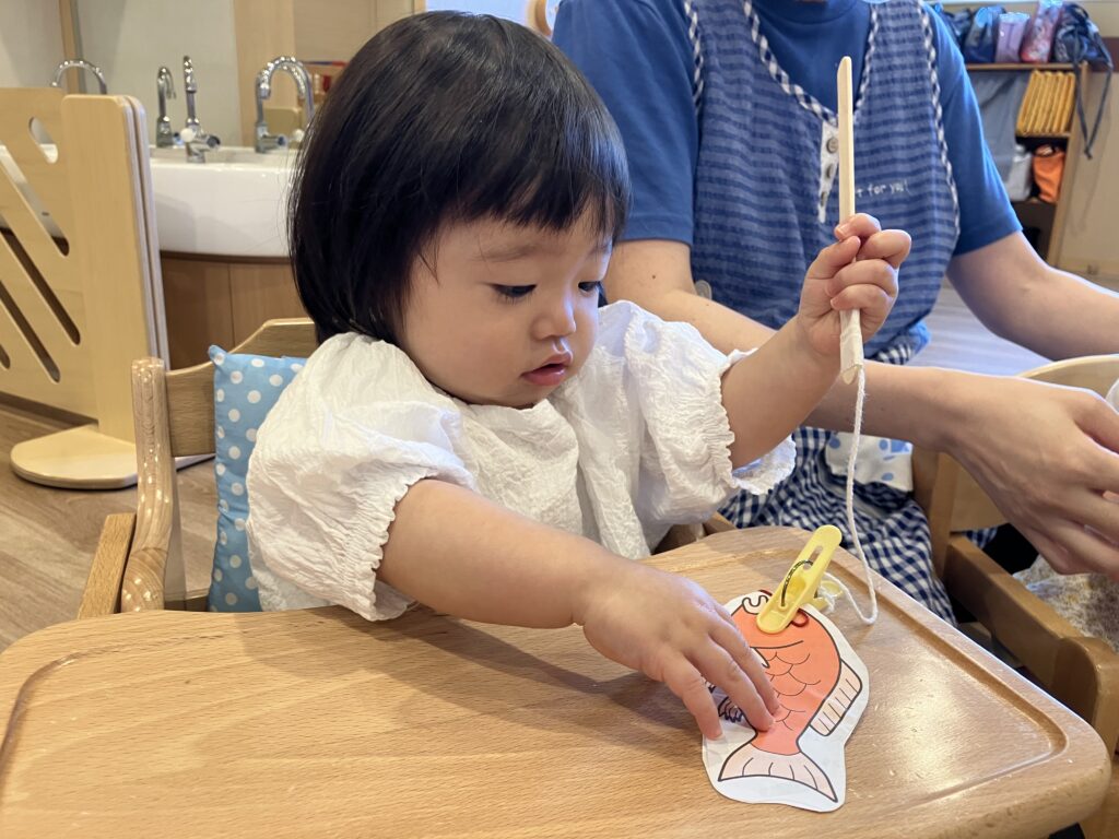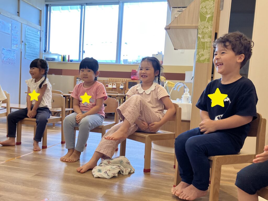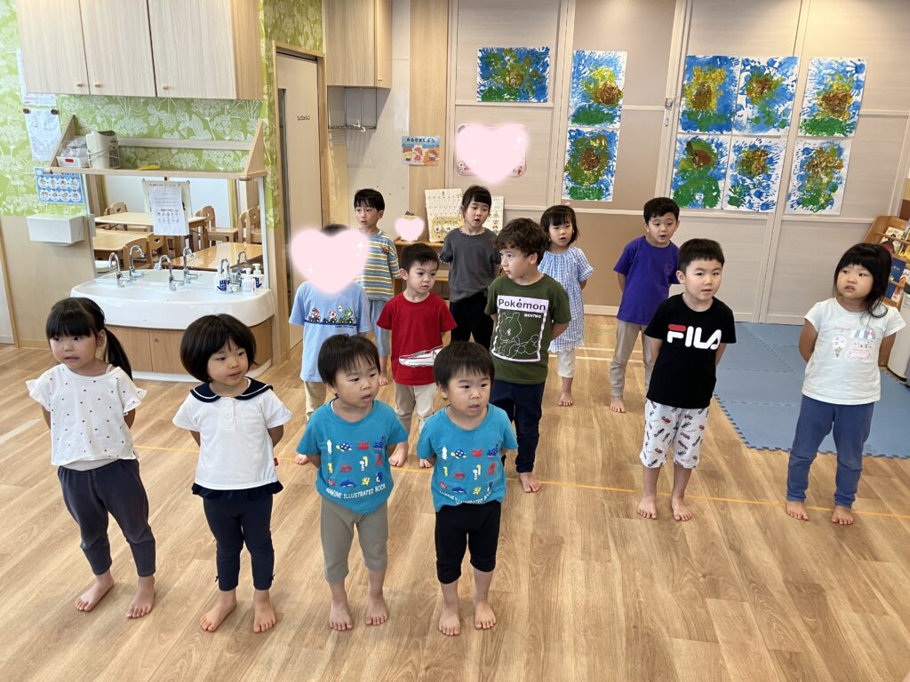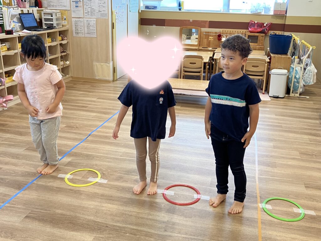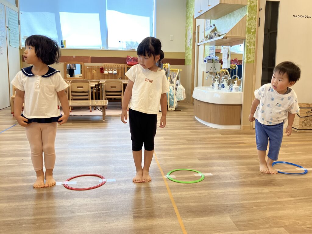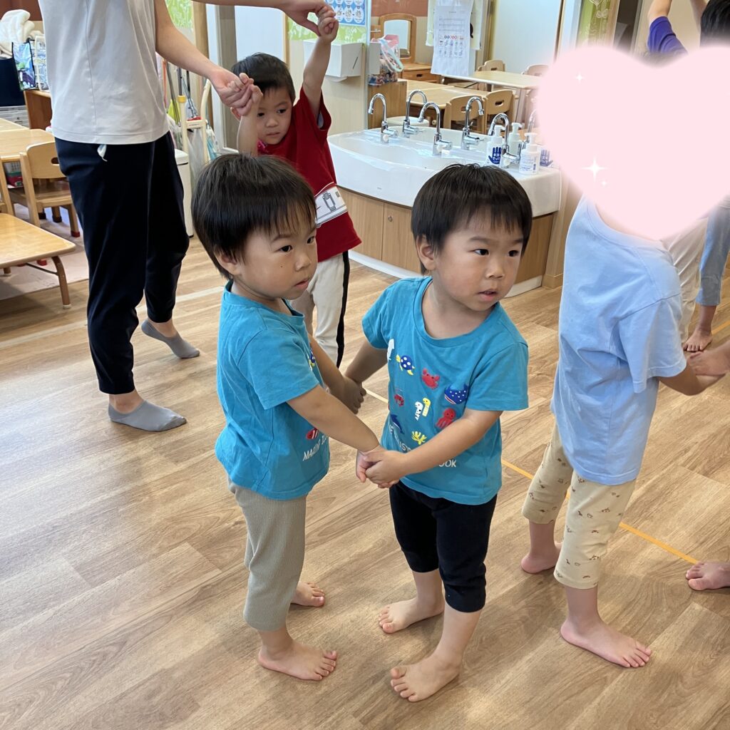 24日(木)のリトミックでは、季節の歌『たなばたさま』『アイスクリーム』を歌った後に、『たなばたさま』でケンパリングを使いながら、リズムに合わせて左右前後に動きました♪