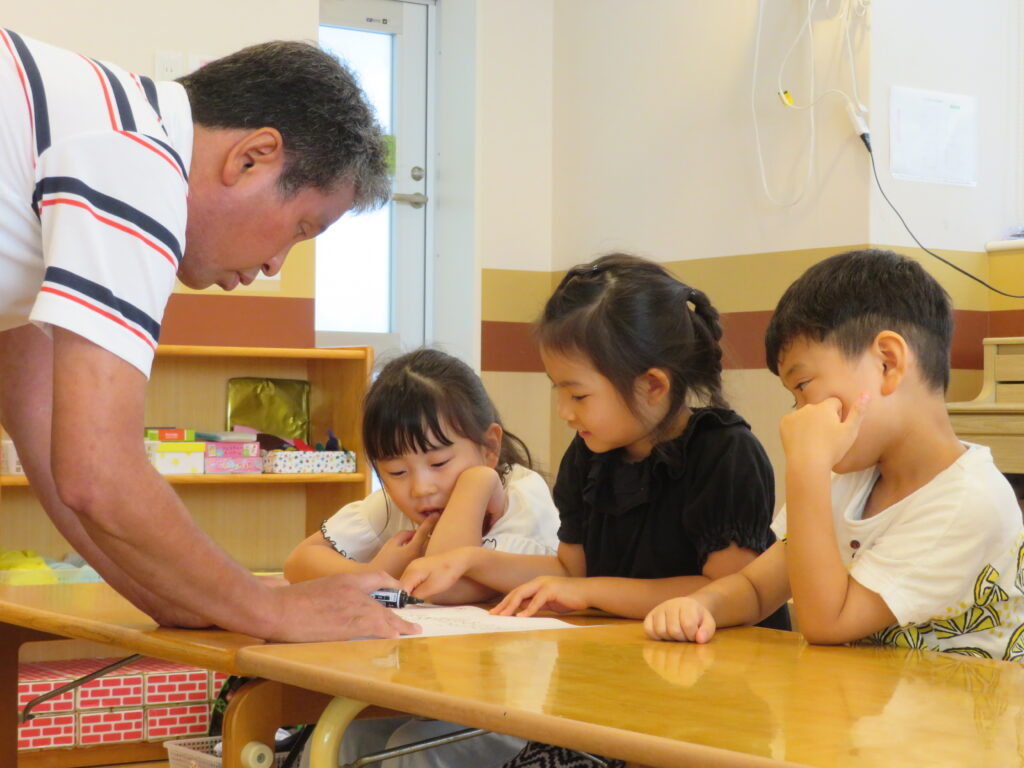 ひまわり組では、『魚は何匹?何色の魚がいるかな?』という質問に、英語で答えていました♪