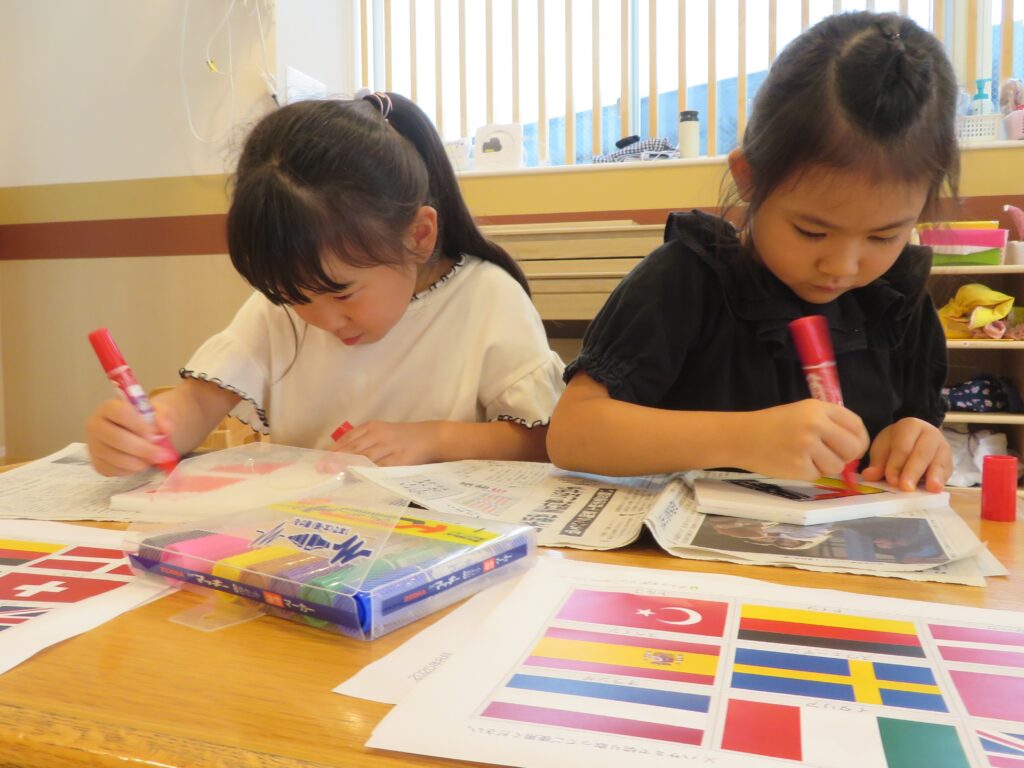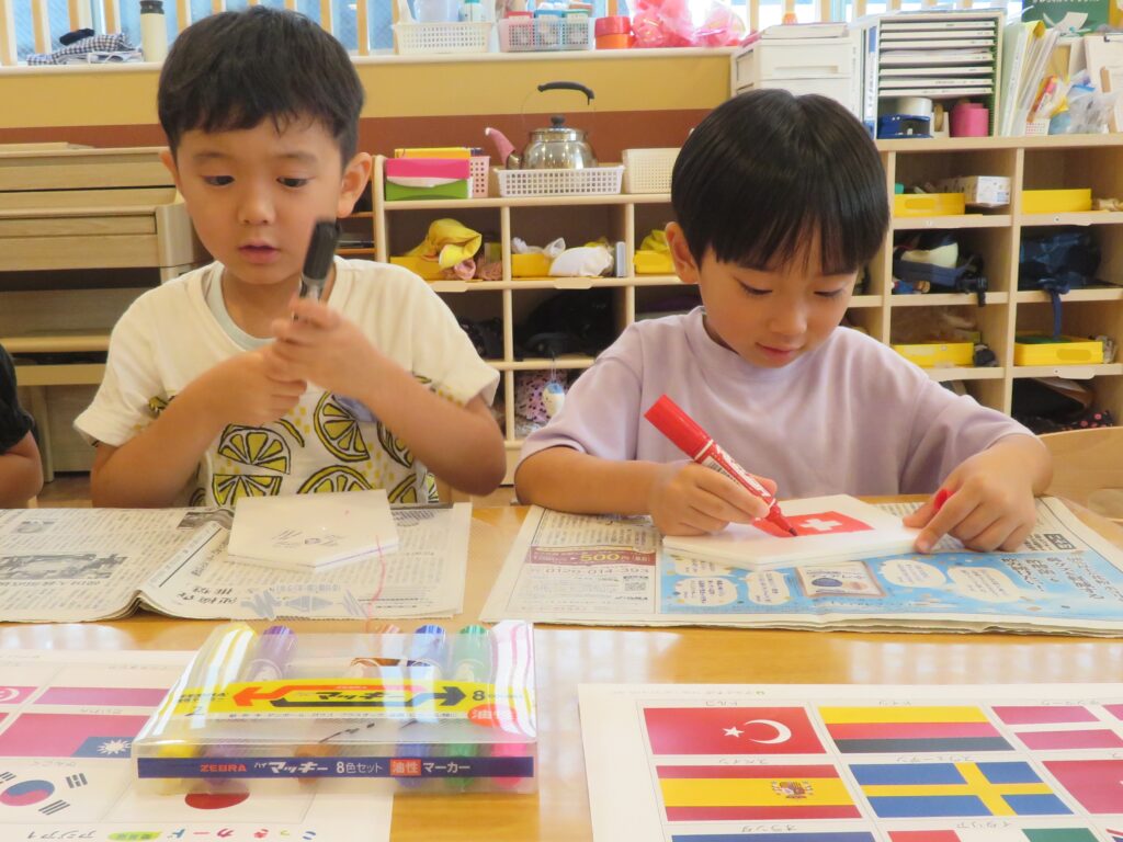 国旗一覧の中からそれぞれ『ドイツ』『デンマーク』『韓国』『スイス』『アメリカ』を選び、自分だけの船を作っていきました♪