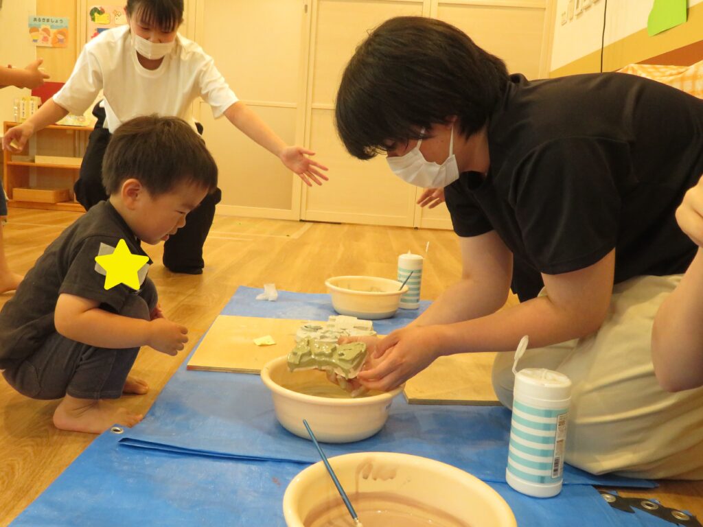 前回作った陶芸の作品を『赤』『青』『緑』『透明』の中から好きな色を選んで、2グループにわかれて色づけしていきました!